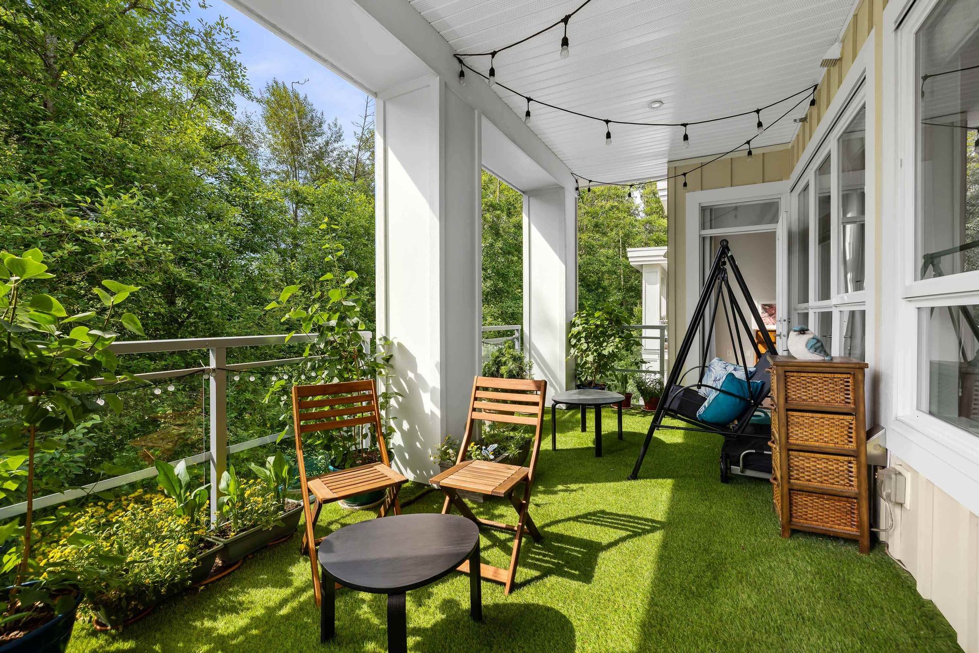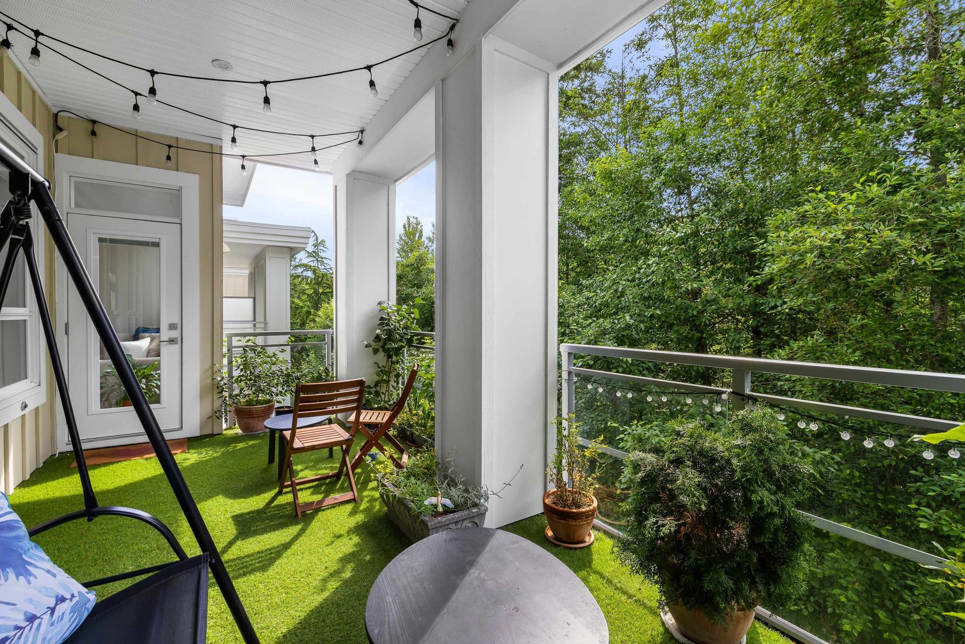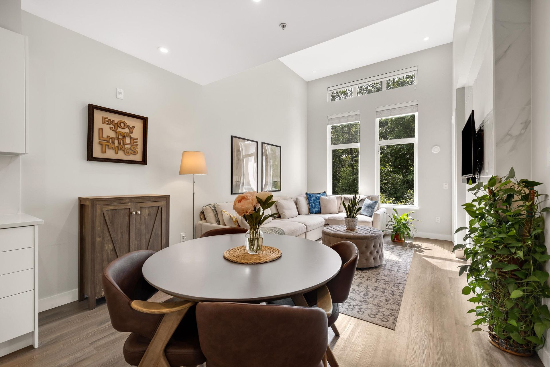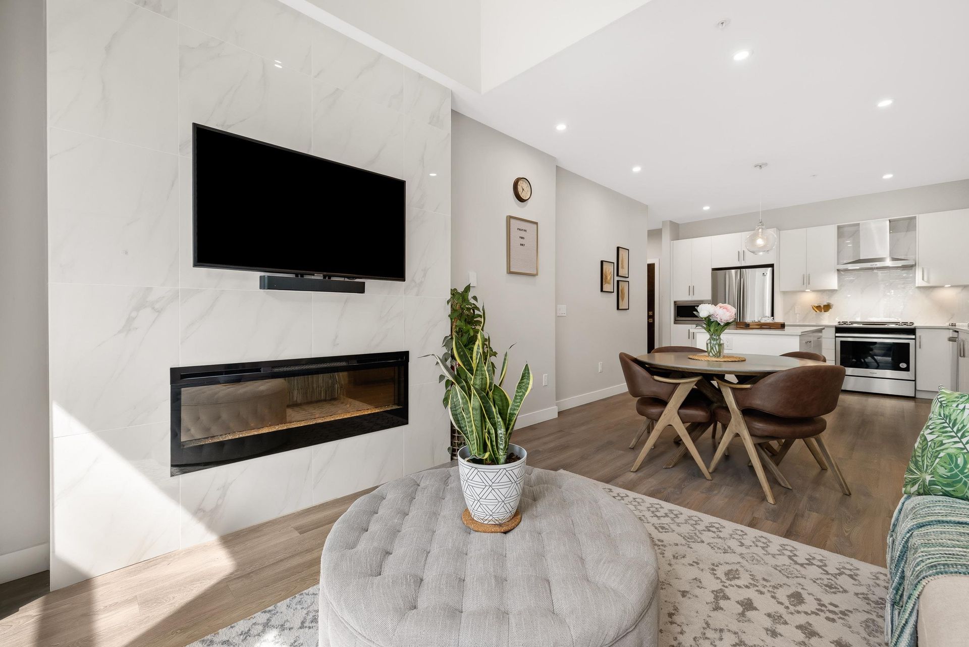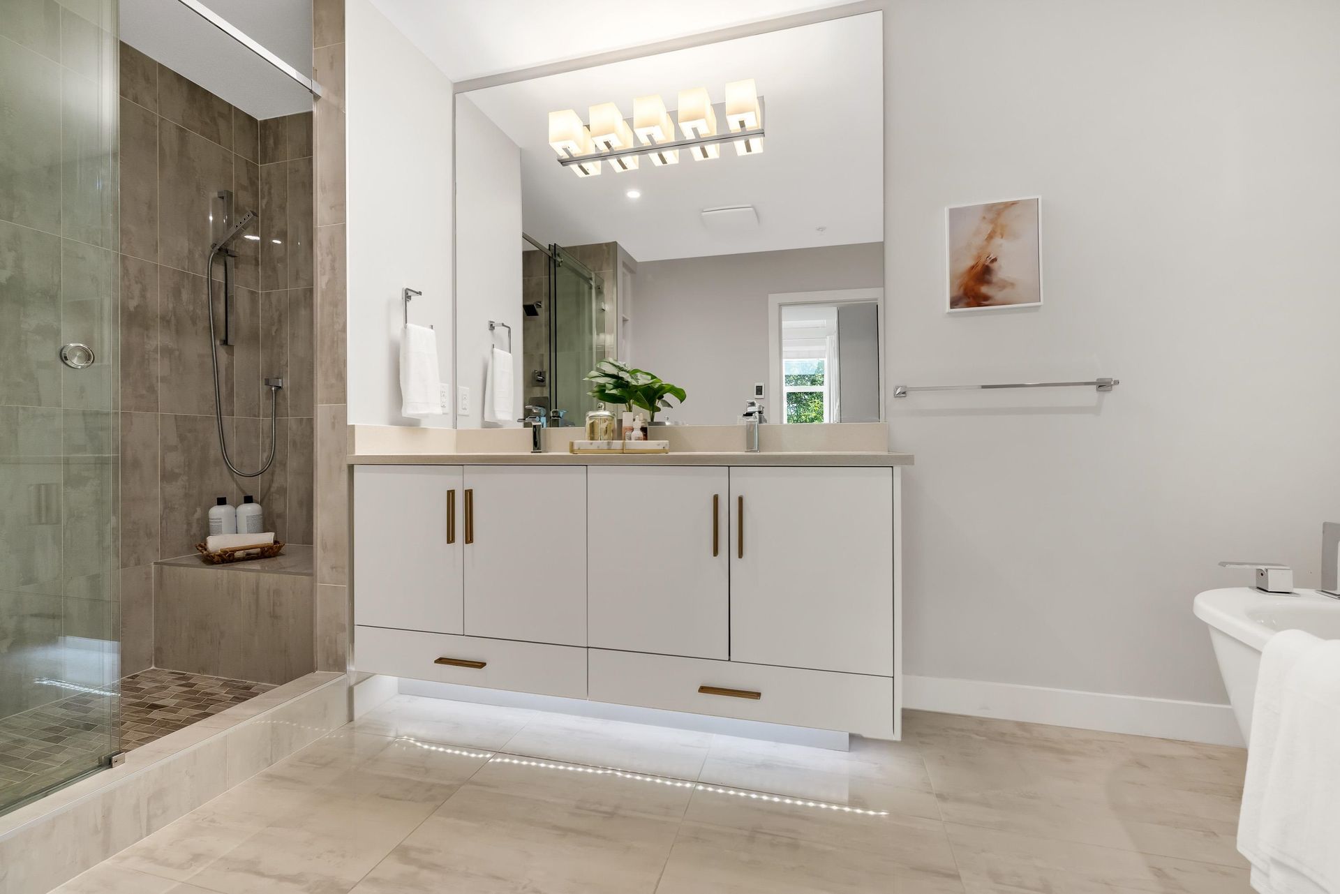 Penthouse living at Headwaters Club! This custom-built top-floor 3 bed, 2 bath home is the largest in the complex, backing onto a lush greenbelt with vaulted ceilings and a massive patio with gas hookup—ideal for relaxing or entertaining. The open-concept interior features all-white cabinetry, an extended quartz island, stainless steel appliances, and custom drawers. The expansive primary suite includes a 6-piece spa-style ensuite with heated floors, under-cabinet lighting, double sinks, walk-in shower, and a freestanding soaker tub. Upgraded MYSA smart thermostats, vinyl plank flooring, 3 parking stalls, and 2 storage lockers. Amenities include a fitness centre and business lounge. Close to Morgan Crossing, shops, schools, Hwy 99, and White Rock Beach. 2 Pets Allowed (Dogs & Cats)!