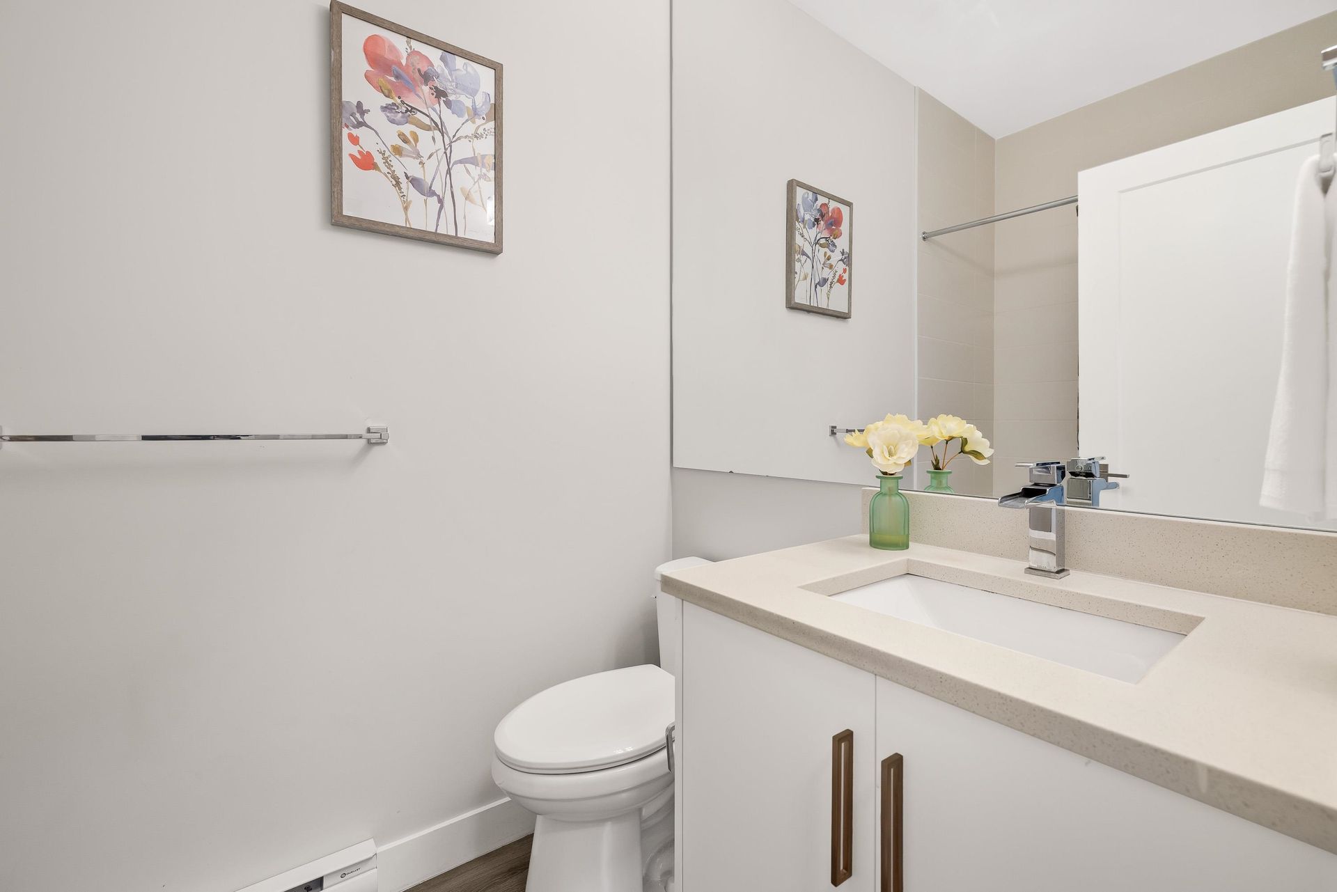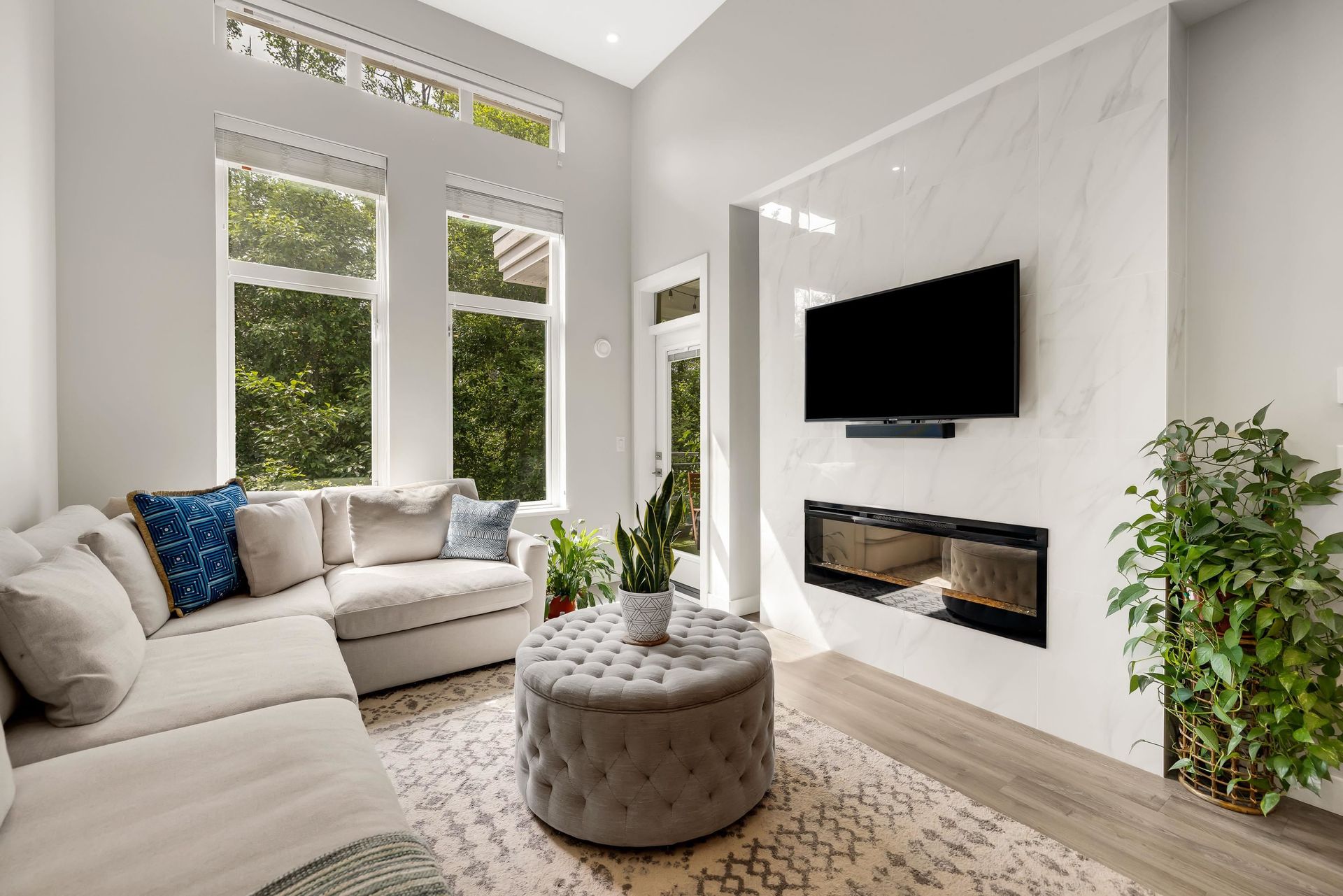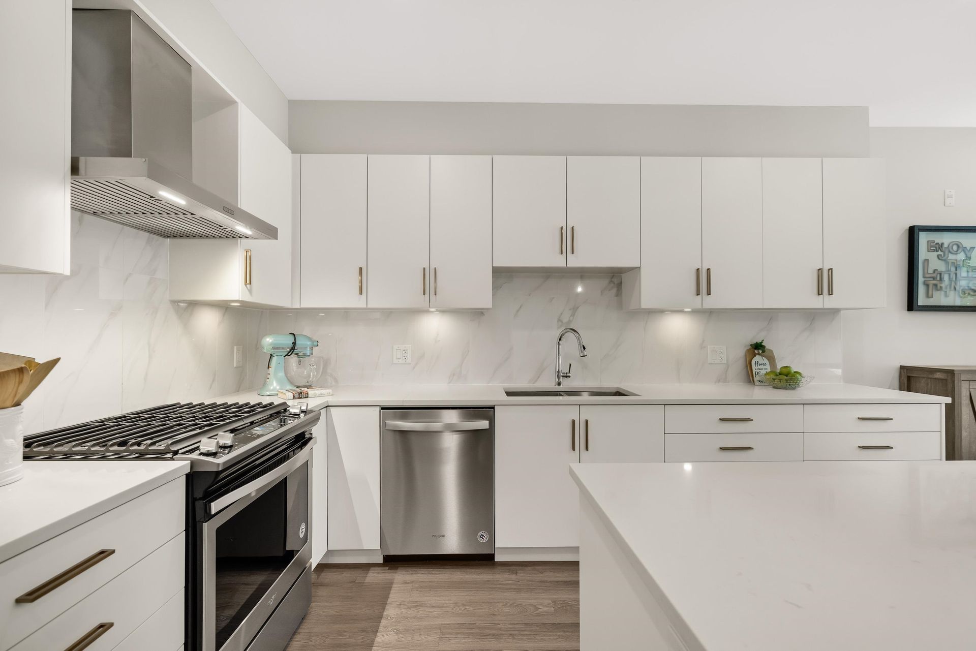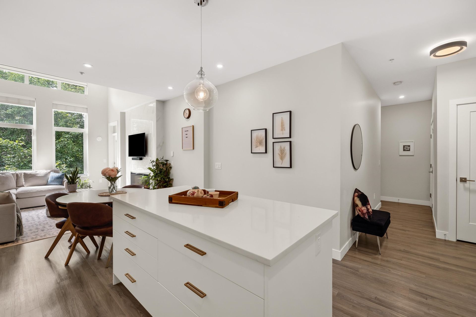 Penthouse living at Headwaters Club! This custom-built top-floor 3 bed, 2 bath home is the largest in the complex, backing onto a lush greenbelt with vaulted ceilings and a massive patio with gas hookup—ideal for relaxing or entertaining. The open-concept interior features all-white cabinetry, an extended quartz island, stainless steel appliances, and custom drawers. The expansive primary suite includes a 6-piece spa-style ensuite with heated floors, under-cabinet lighting, double sinks, walk-in shower, and a freestanding soaker tub. Upgraded MYSA smart thermostats, vinyl plank flooring, 3 parking stalls, and 2 storage lockers. Amenities include a fitness centre and business lounge. Close to Morgan Crossing, shops, schools, Hwy 99, and White Rock Beach. 2 Pets Allowed (Dogs & Cats)!